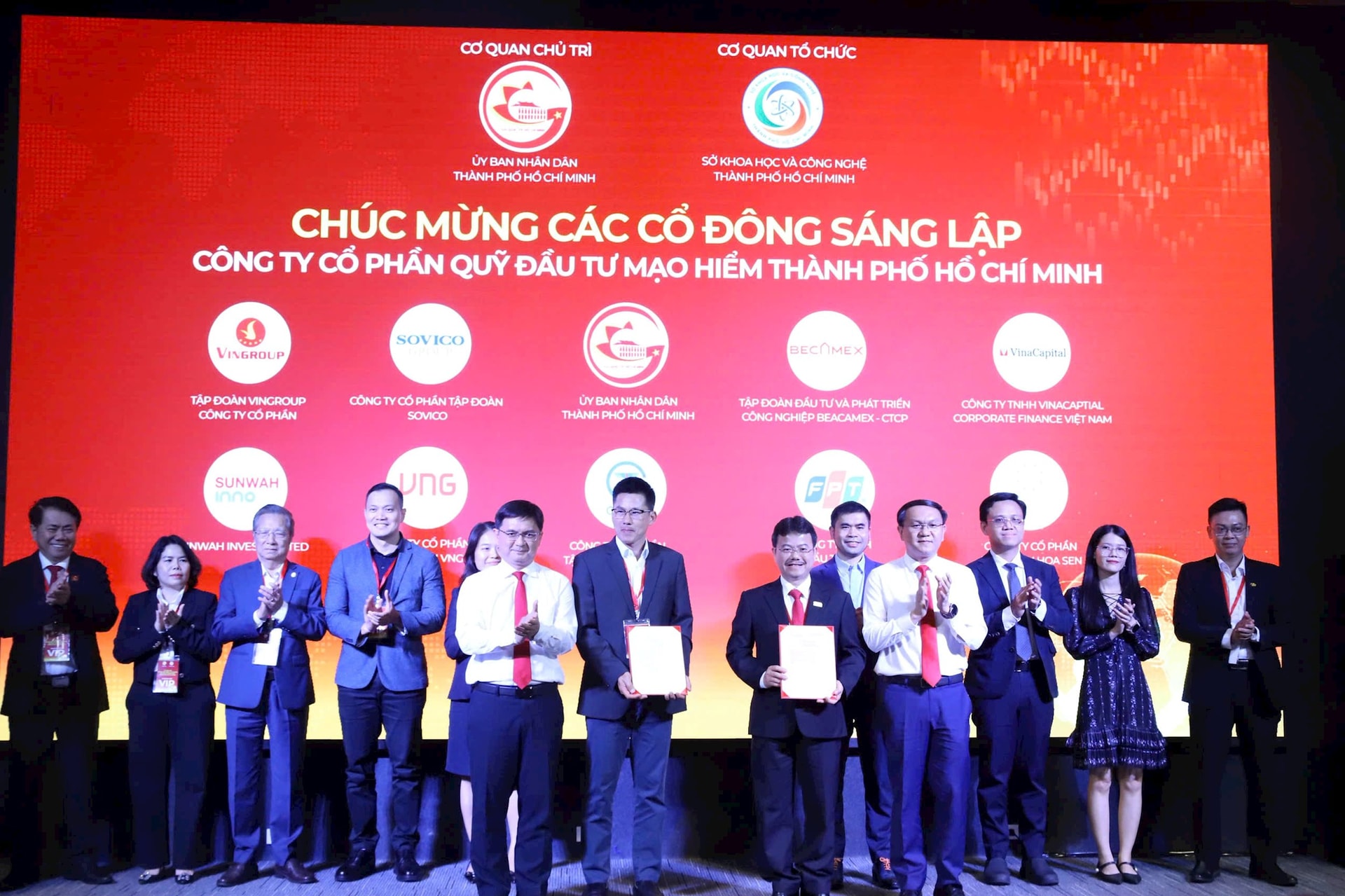 Ngày 17/4, Sở Khoa học và Công nghệ TP.HCM tổ chức Lễ ra mắt Quỹ đầu tư mạo hiểm TP.HCM, với pháp nhân vận hành là Công ty Cổ phần Quỹ Đầu tư mạo hiểm TP.HCM (HCM VIF JSC). 9 tập đoàn gồm Sovico, Vingroup, Becamex, VinaCapital, Sun Wah, VNG, CT Group, Hoa Sen và FPT cùng tham gia góp vốn để sáng lập Quỹ đầu tư mạo hiểm Thành phố theo mô hình doanh nghiệp cổ phần.